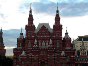 The State Historical Museum stands at the western end of Red Square. The building is elaborately covered in ornate turrets, pinnacles and decorative saw-tooth cornices. It museum was built between 1875 and 1881 by the architect V. Sherwood. Within the museum are ancient artifacts dating from prehistoric time up until the Russian Revolution.